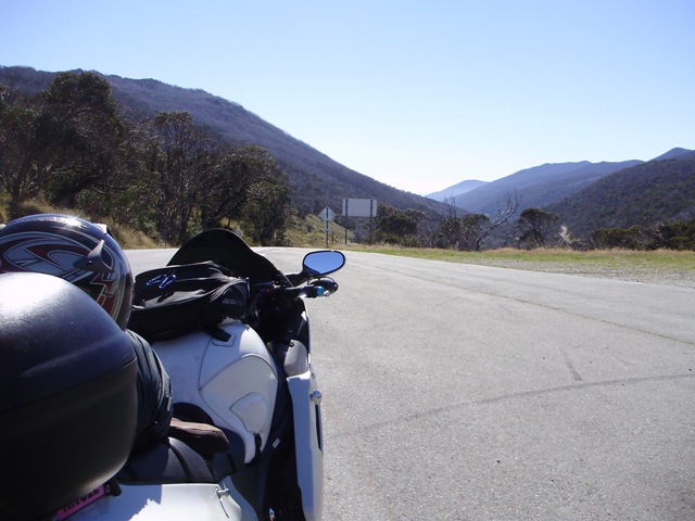 The group breaks again and it’s a nice run along the Murray Valley Way. About half way to Corryong we catch up with Gene who is setting a nice pace and so he leads us into the Caltex servo (about 20kays). A couple of the boys buy 2x 6 packs of alcoholic cider something or other and I generously offer to carry it in my top box for them. So with the cargo safely tucked in we headed back into Tintaldra and across the bridge into NSW riding through such peacefulness it just amazes me this country of ours and onto the Southern Cloud Lookout. Again have to thank the corner markers and I waved at Stevelyn to let him know were the last riders and to come.