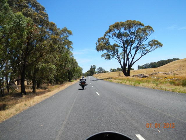 Down through Batlow and into Tumbarumba (what another noice piece of road). Orchards flanking both sides, dark and light of the shadows providing pockets of shade and only one sneaky Mr Plod parked on the side of the road with his headlights on. Tumby for lunch and the town is full, chockas due to a Rodeo…Yee Haw!!! Only place open for lunch is Mountain Mac’s take away. The heat continues to climb and I can’t wait to get my gear off!! Lunch done, gear on (it’s getting heavier) lets get goin’ our friends Rick and Eilsa in Tintaldra are expecting us.
