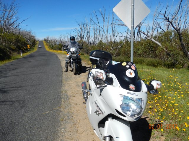 Now up the meandering road to Falls creek, how god damn hot is it…have I mentioned that, how hot it is!! “Hurry up and get the pic I’m melting”, says Karl – no kidding Dick Tracey!