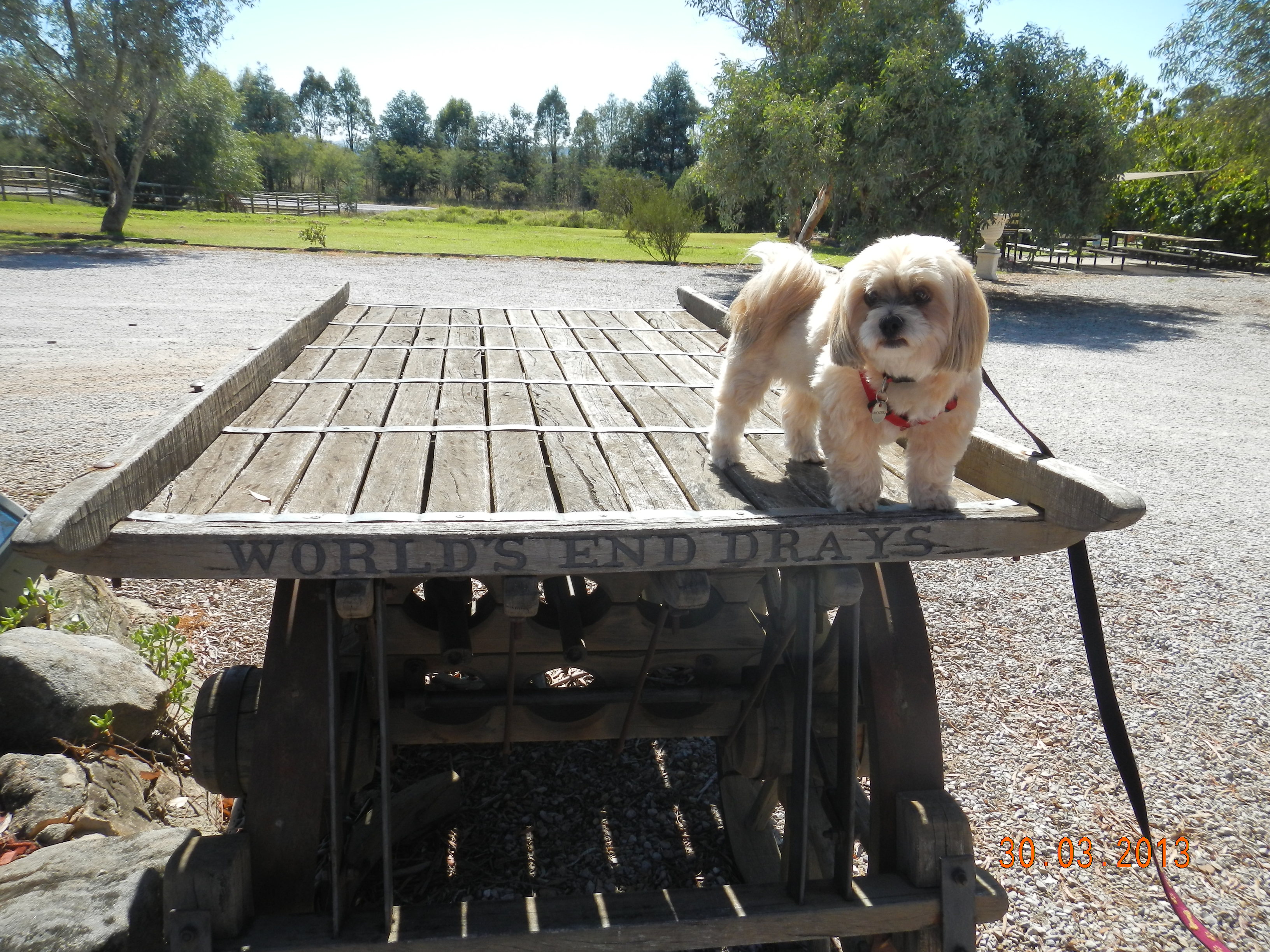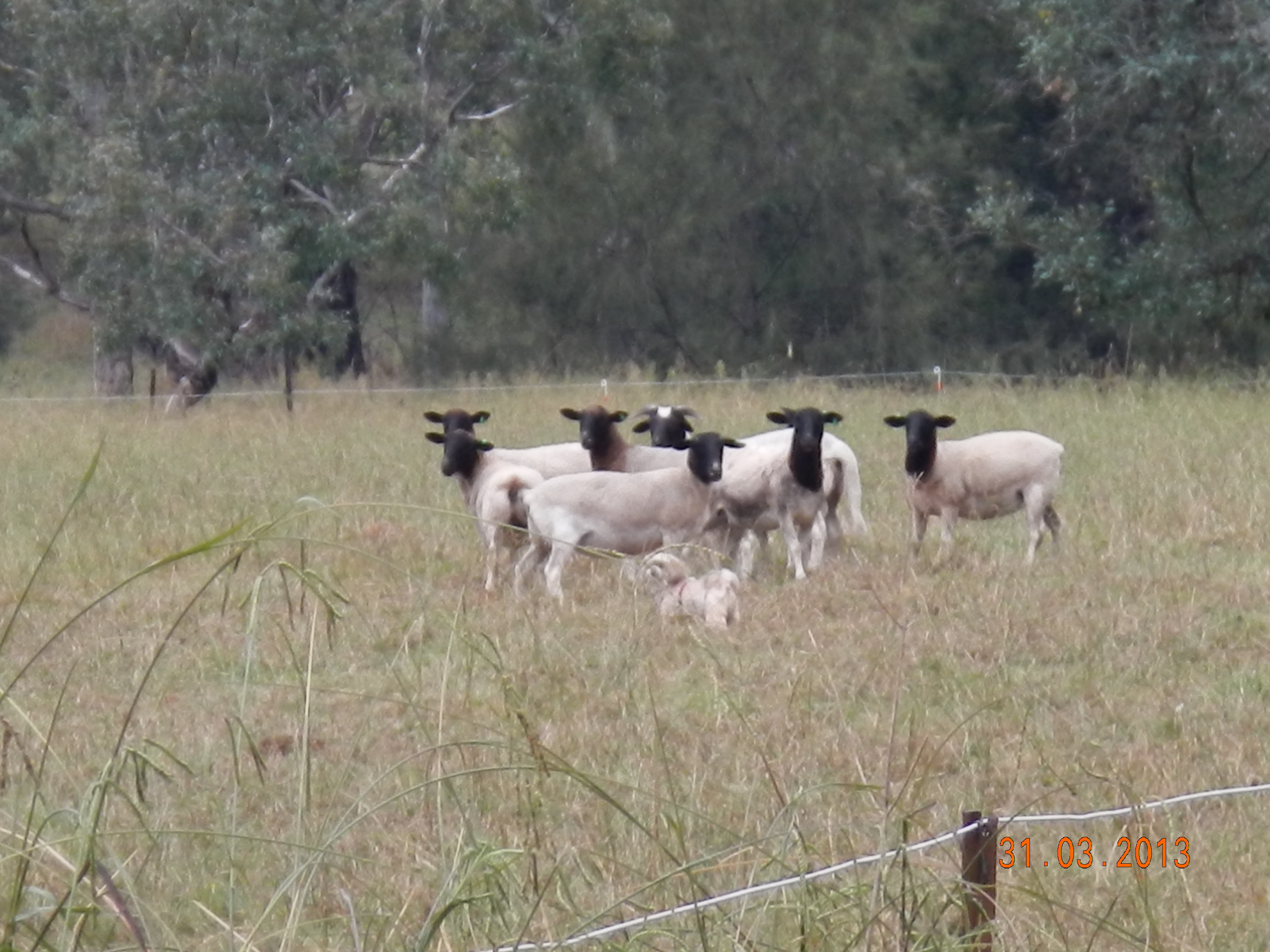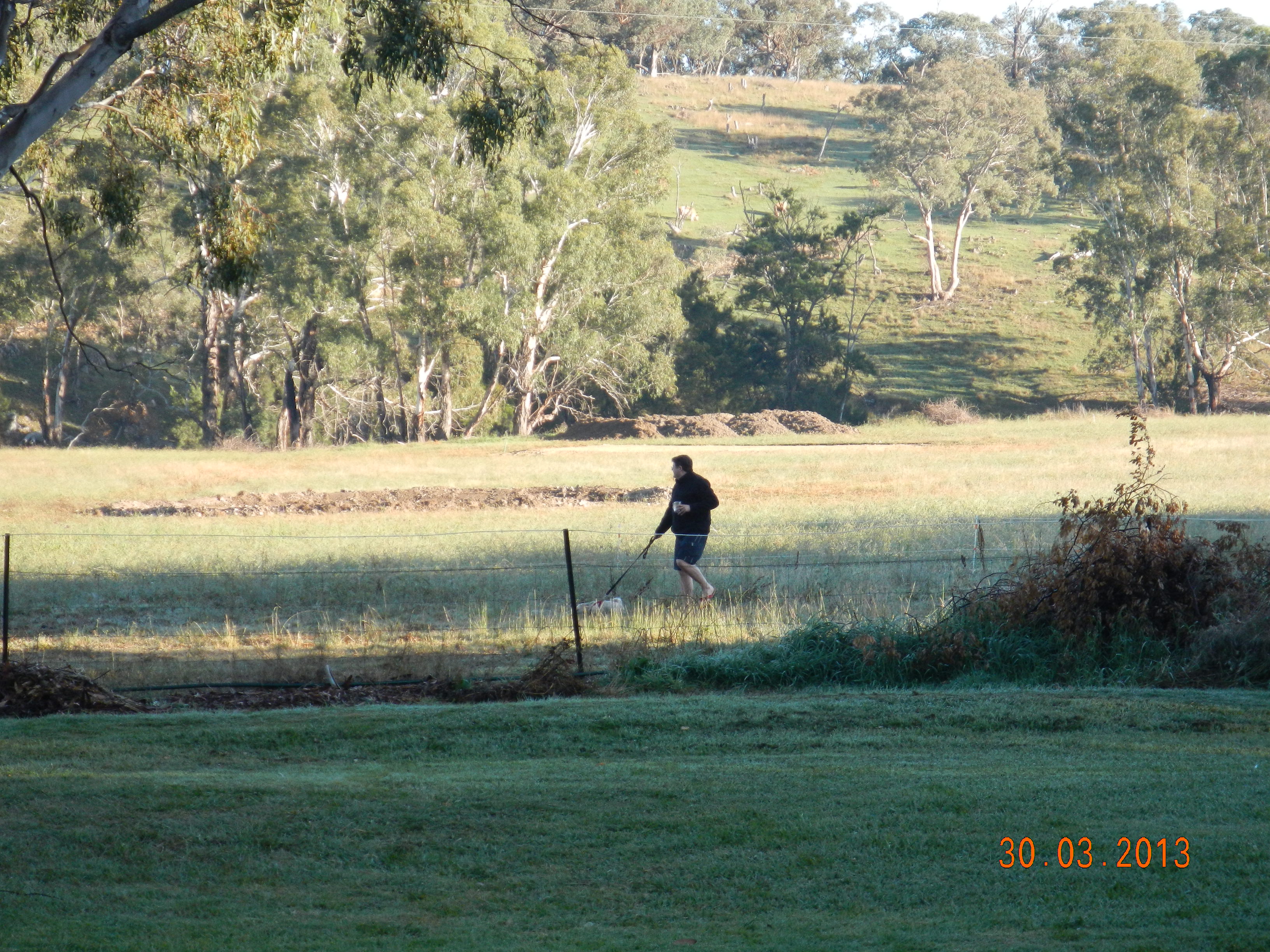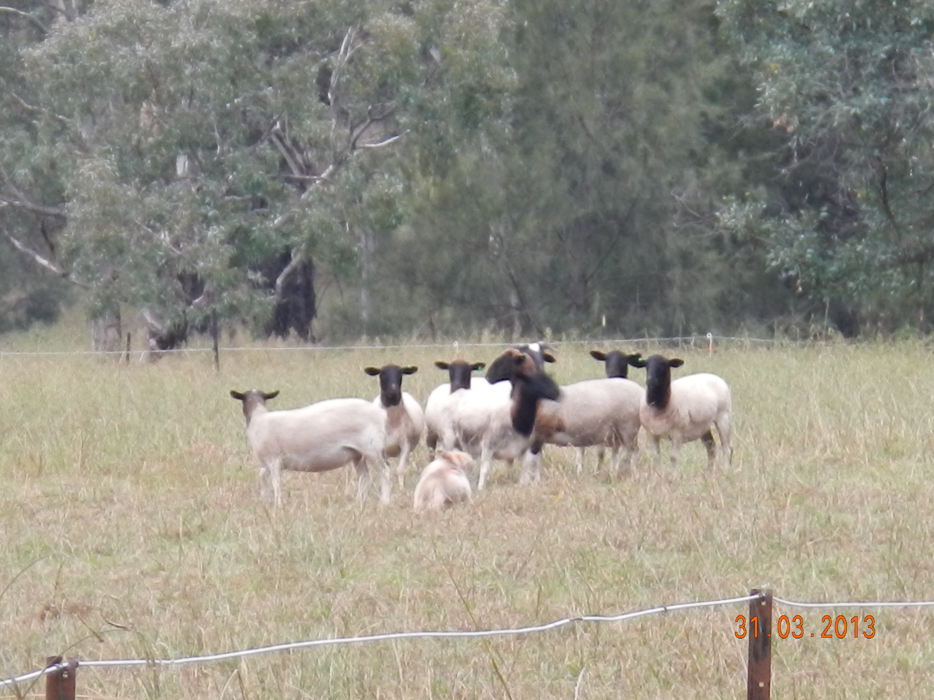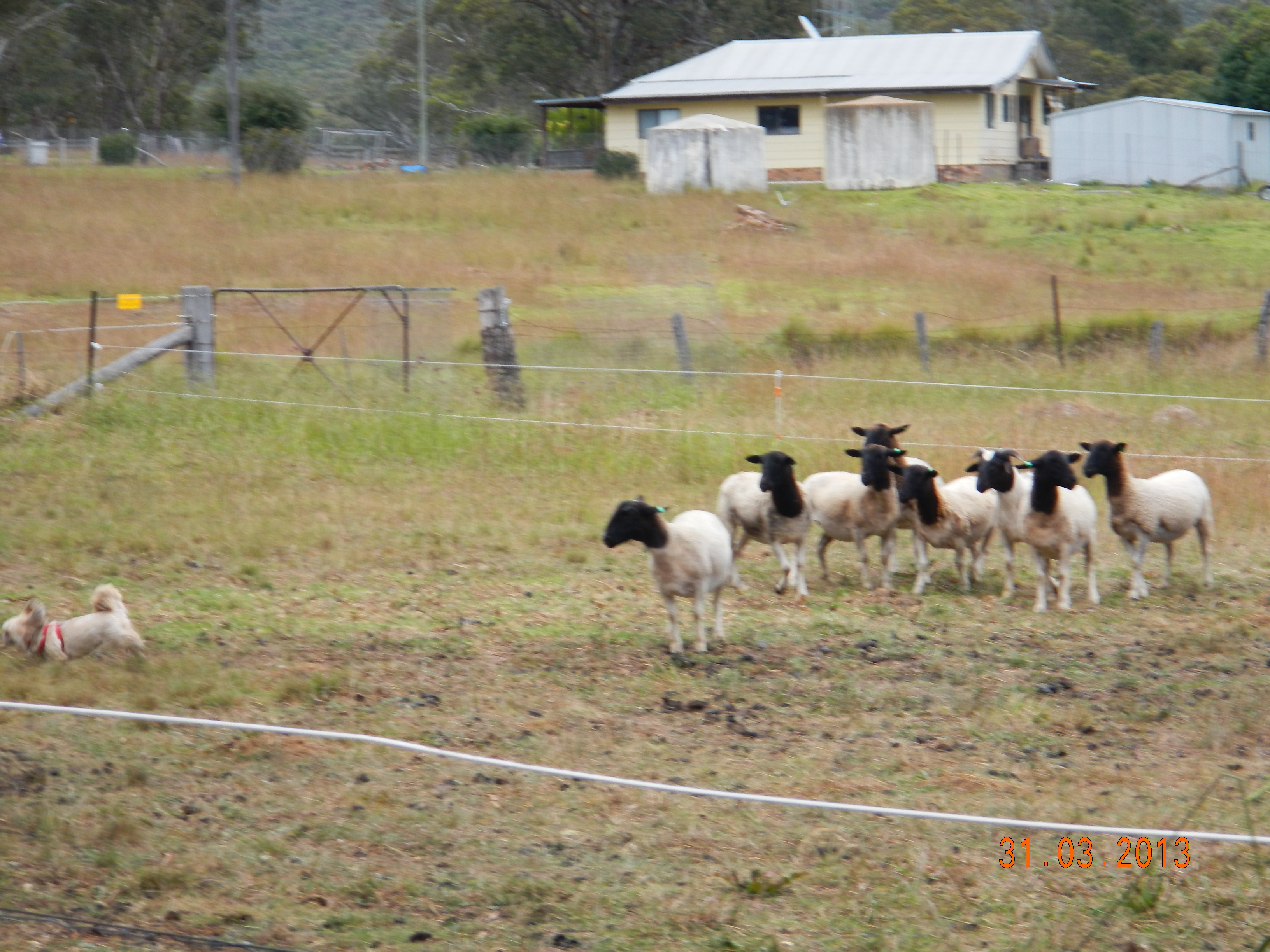 We had rain last night, not much just enough to make things wet but not soaking. I get a sleep in…ahh and Kim and the boys have got breaky started already. Ella’s happily wandering around on her lead with Karl but he decides to let her off again. Words of warning from me “you know she’s going to head straight for the sheep and you know where you’ll be going”. Karl “no she won’t, she’ll be fine” (famous last words, again) – she’s off like a rat up a drain pipe after them sheep. She didn’t even stop for the fence this time she went straight through into the paddock. Anyways, here’s the result…