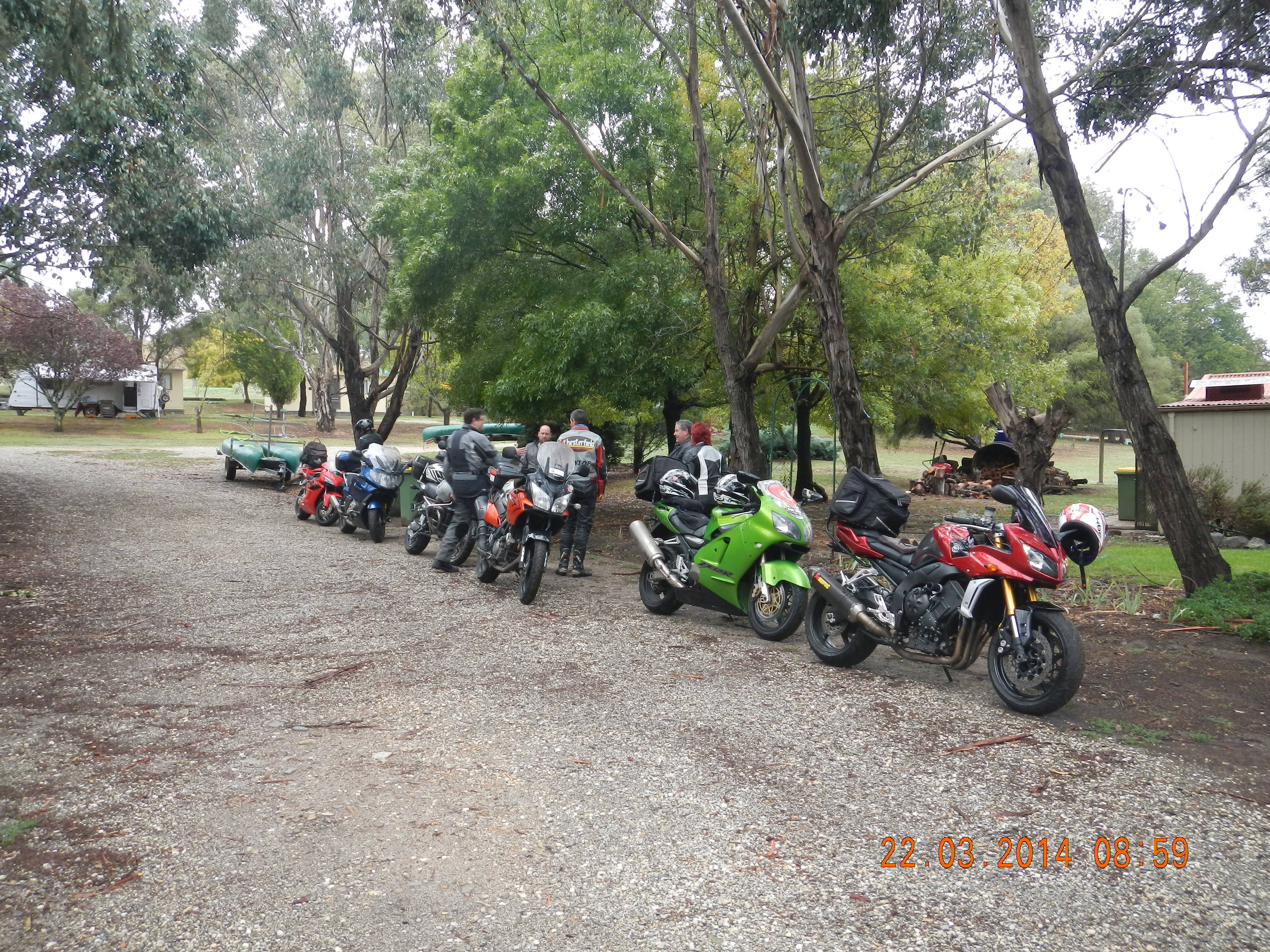 The road snakes before Elliot Way are still pretty bad and in the wet are horrendous. Down through Elliot Way (there a reasonable amount of new surface..pebbles) but I have lost so much confidence that even the 4WD’s are overtaking us (Karl and Andy just a bit embarrassed following me…sorry guys). Turning onto Tooma Rd we haven’t got far now, go past The Southern Cloud Lookout and onto the home stretch. About 1 kilometre out of Tintaldra the heavens opened up and rain on our parade into the caravan park.
