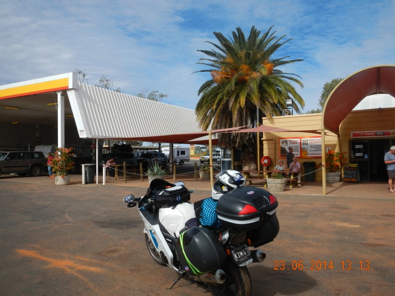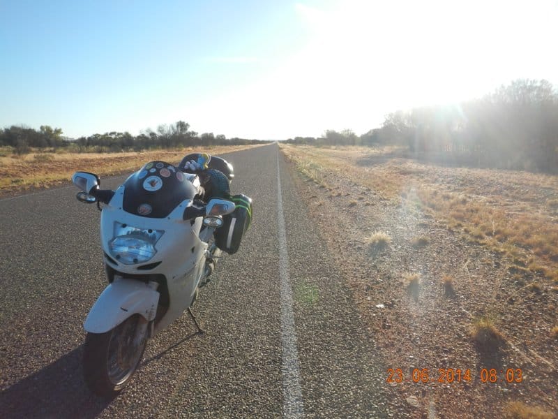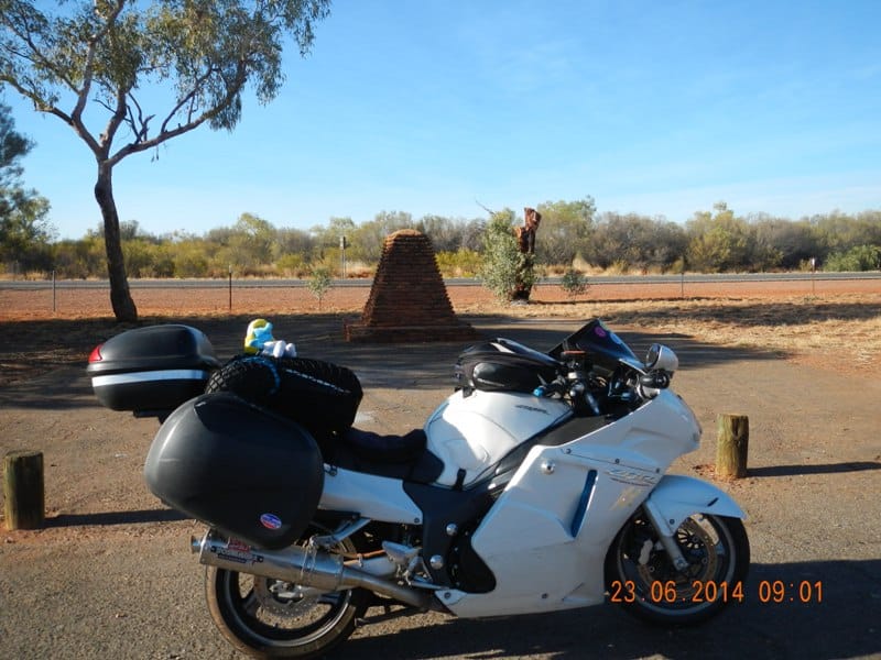 The kilometres just disappear at that speed and before long I reach Aileron for my next fuel. Before reaching Aileron, a police car went flying past me (he must’ve been doing close to $1.80) and then we played tag a couple of times. All the time I kept in the back of my mind “he can stop you if he thinks you aren’t riding safe”. I didn’t need to worry cos at one point he gave me a wave.