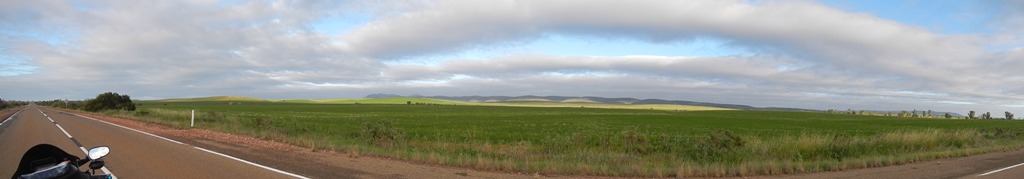 I reach Mundi Mundi Lookout and what a surprise, it’s all gravel and off camber – ARGH!!! Ever so gingerly I edge into the lookout but end up stopping short of turning around – it’s just too bouldery to manoeuvre around on. Take some beautiful pics, it really is exceptional viewing out here. As far as the eye can see and green it’s quite breathtaking.
