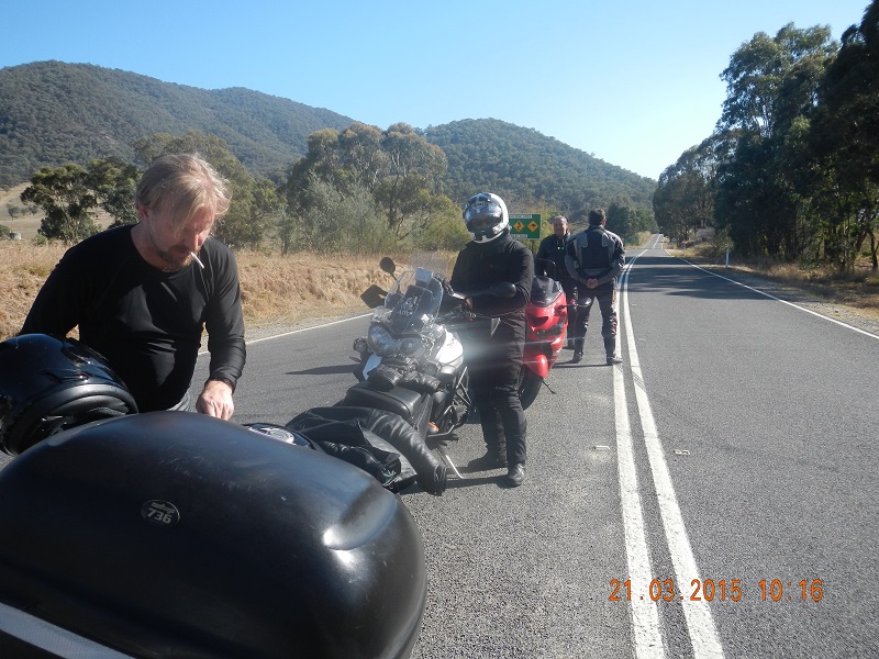 We pick Lui & Shannon (know as Dude) up at Pheasants Nest and got going. The slab to Goulburn is pretty uneventful, before hitting the back road to Bungendore for morning tea (and fuel for Dude as he only has a 200 kay range….give or take a twist of the wrist..lol). Next is Cooma – hello & goodbye before turning off too the my favourite 50 kays of road to Adaminaby. Let’s just say here, it was very spirited riding and if my tyres weren’t scrubbed in…..well they were then…he he he 🙂 Huge smile from Dude when we got to Ada as he hasn’t done any of these roads.