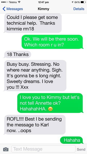 Somewhere during all this planning, Karl sent me a text message “So Howsit?” and I thought I was replying. However as it turns out I still had my phone on Cuddles message and this is how it went…..