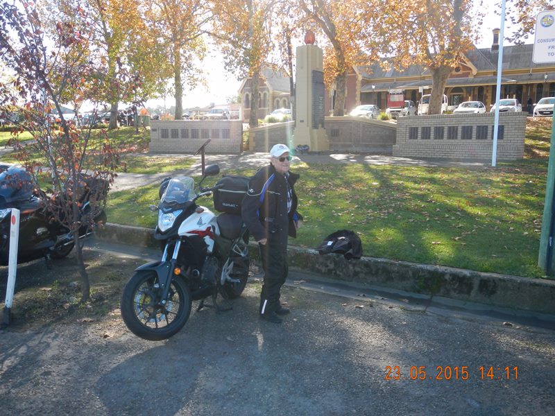 Watching the sun come up against our backs was lovely. The dawn of a new day, crisp air, fogging visor, and runny nose…lol and the sun shining right in our eyes. The pace this morning was steady a nice limit pace which had us going through Forbes, Grenfell, Gooloogong before heading into Cowra for fuel, breakfast and a comfort stop. Although Macca’s was on the way in, on the advice of a local we went to this little bakery, next time we’re stopping at Macca’s.