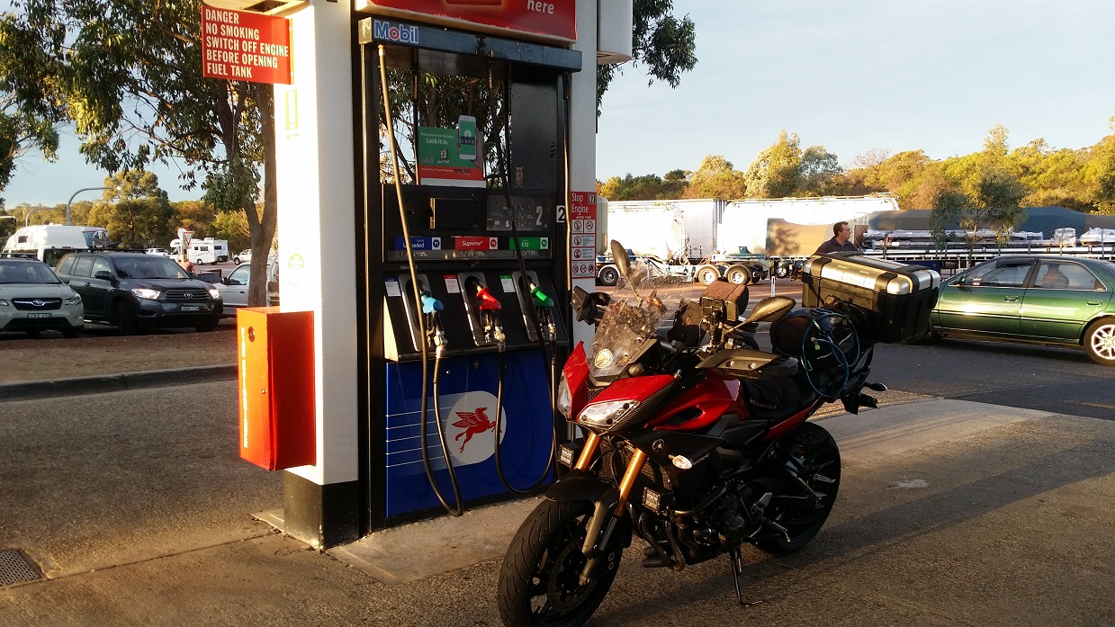 Blue skies, a slight breeze and lovely riding temperature, what more could you ask for! Wagga Wagga comes into view and a debate whether to stop for fuel or chance making it to Gundagai. Let’s live on the wild side…..lol. The reserve light starts flashing 22km from Gundagai (and I’m not real sure if I’m going to make it). The service centre sign put a smile on my face and the fears on running out of fuel dissipate as I pull up next to a pump.