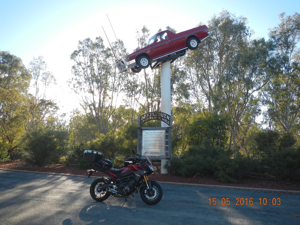 Into Deniliquin for the breaky of champions…well weary homesick motorcyclists anyway. A quick stop for “things on poles” pic before heading off.