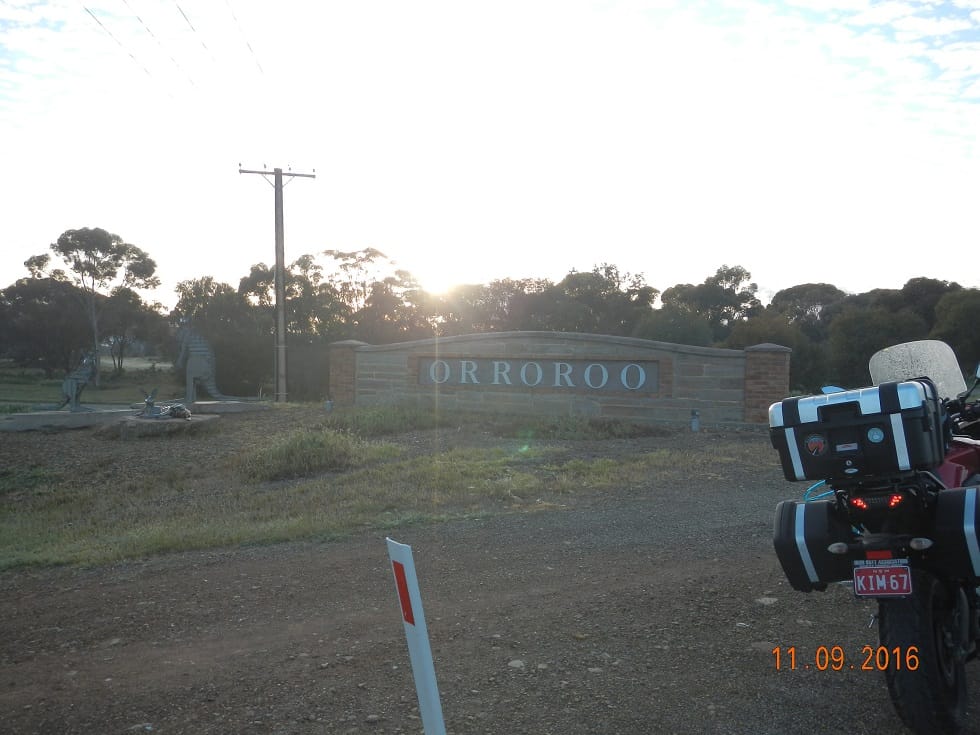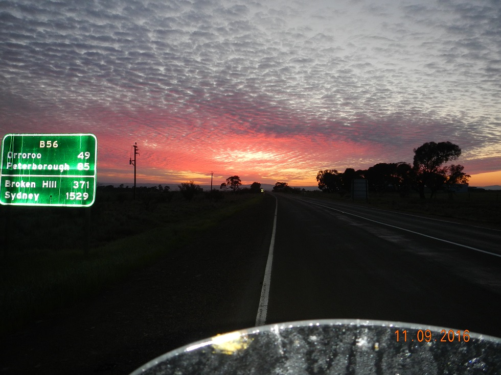 Dudley and I aren’t fond of dirt roads but this little one was worth it to get to the tree. Soon into Orroroo (no scones today) as the sun starts to ride to eye level.
