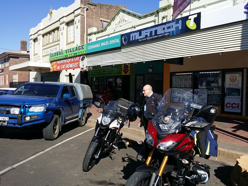 It’s a little cool this morning and I’ve got the heated gear plugged and playing and I wonder how dad is coping as he doesn’t have any of this new fang-dangle gear….insert dad voice here “I’ve been ridding for 70 years, long before all this fancy stuff come out”….when I was a boy….. He’s old school, he’s layered up and only seems to be struggling with the position of the sun causing his eye to water (I’m sure there’s more to it, but we’ll run with that). Continuing on we approach the unmistakeable structures depicting Galahs, ah we must be nearing Gulargambone…he he he. Not long and we are into Gilgandra for fuel and a short break. We are doing great time, although it doesn’t really matter how long it takes today as long as we are enjoying the ride and the time together. Into Dunedoo and we decide to push onto Gulgong for lunch (since we had a late breakfast). We found a lovely little place called Mayne St Café where we had a yummy pie with sauce for me and a yummy sausage roll for dad.