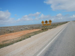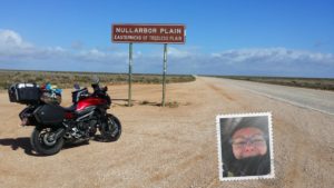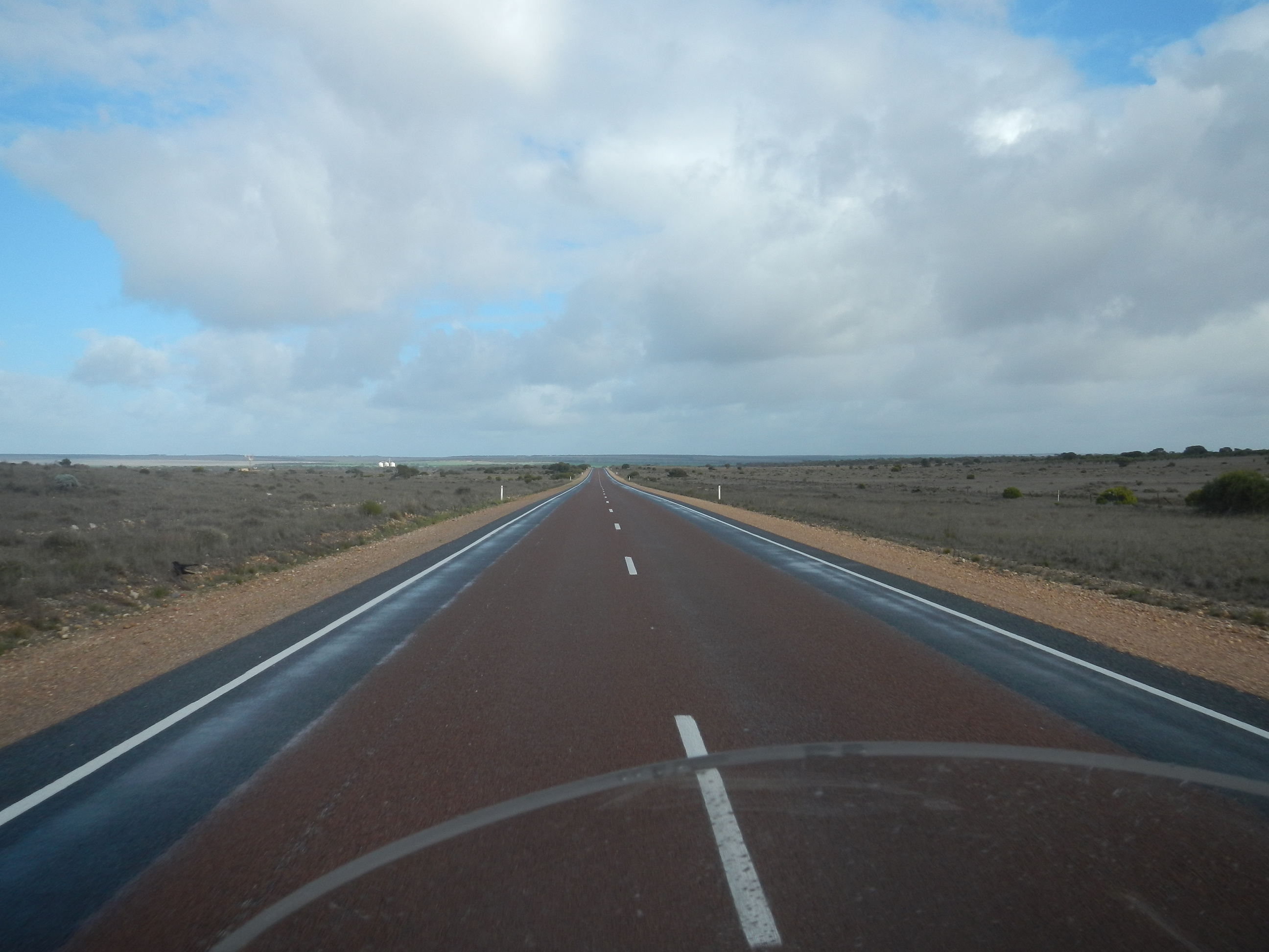 Not too far to go now….only 330km..YAY!!! But look at the scenery….totally amazing. There is so much to see and so much of nothingness that put you at easy with the universe. I tried to stop for a pic a little further back but the verges are real dodgy and I couldn’t safely stop besides the wind is blowing pretty hard now and I was worried Dudley might blow over. Nico caught me and asked if I was ok, gave him the pic sign and he said there was a better place a few kays down the road. To right there is – thanks mate. The Nullabor Plain – I made it. WOO HOO!!! How inspirational is this place. The never ending horizon of for a now a beautiful blue with the stretch of cloud like a blanket rolling up towards your chin to tuck you in….breathtaking. In case you were wondering, yes, it’s still damn windy.