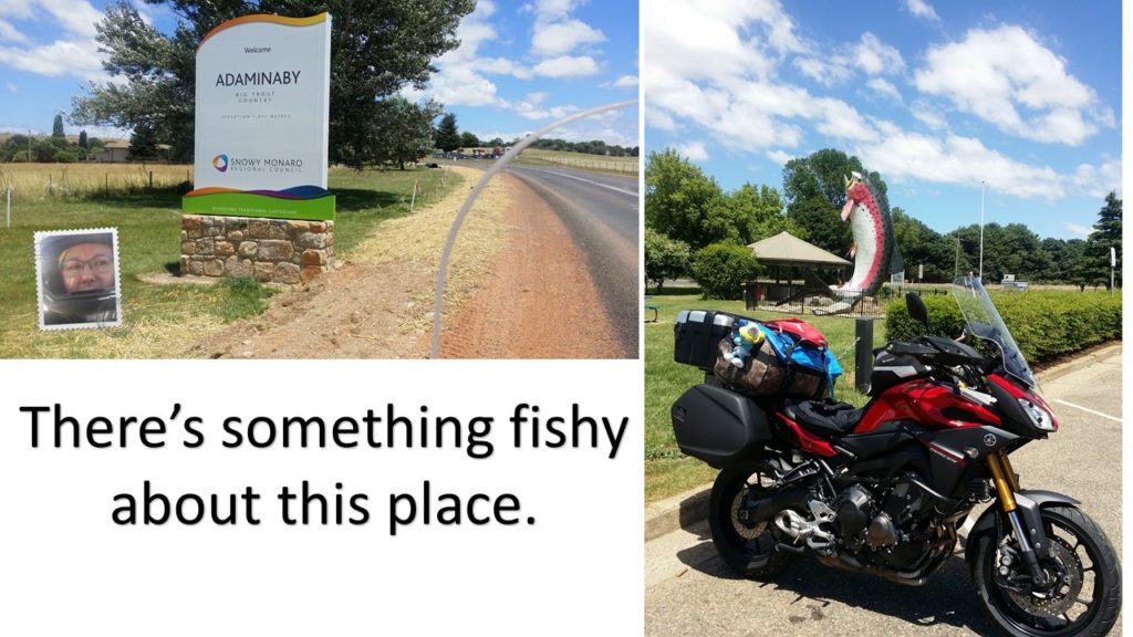 Down the Monaro and through Cooma, just putting along on the limit (with the cruise control set). Then turn onto my favourite 44km of road – the Snowy Mountains Highway but today, I was a good girl as there were some local law enforcers out and about and let’s face it…..it’s not worth spoiling a holiday with an present you don’t want. Lunch and fuel in Adaminaby. Now, I had the foresight to actually phone ahead to make sure fuel was available but didn’t think about food….lol. So a tin of flavoured tuna from the BP while sitting in the shade of the awning next to Dudley on the ground was it…5 star all the way.