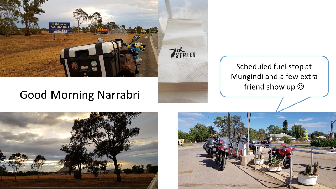 Into Goondiwindi for lunch and fuel and what a surprise bump into a few FarRiders heading home – Clint & Drain. Inside there are more and I join them for a quick bite, check in with the Tenerfield Lodge Caravan Park to let them know I will probably be in after they close so make the necessary arrangements before heading out to complete my journey for the day.