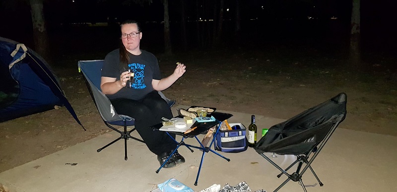 After Felicity arrived and we had a nice relaxing dip in the spa we ventured back to camp for our dinner of champions……..wine with cheese, bickies and dip – naturally 😊