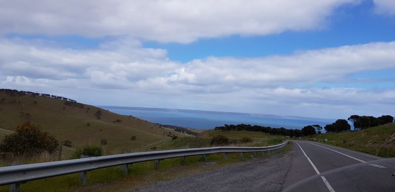 From Hahndorf it’s a lovely run south bound, the sky opens up with blue and the fields are green and luscious. Echunga, Meadows, Willunga HIll, Myaponga, Yankalillia and then the meander down and round the mountain to Delaware. The scenery is beautiful and lush such a contrast to the drought conditions being experienced elsewhere in the country. From Delaware, it’e like sitting on top of the world looking down on the creations that form the Penninsula. At the top of the mountain before you transend into Cape Jervis, I pulled over to get this pic.