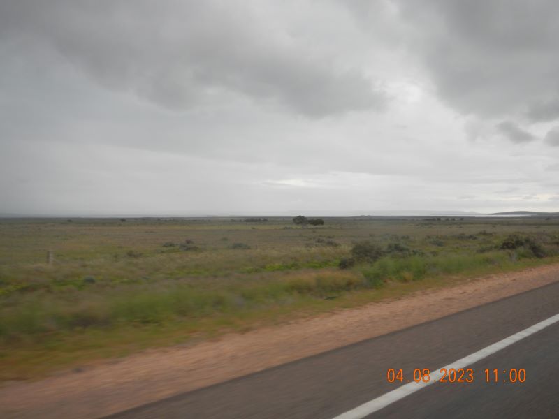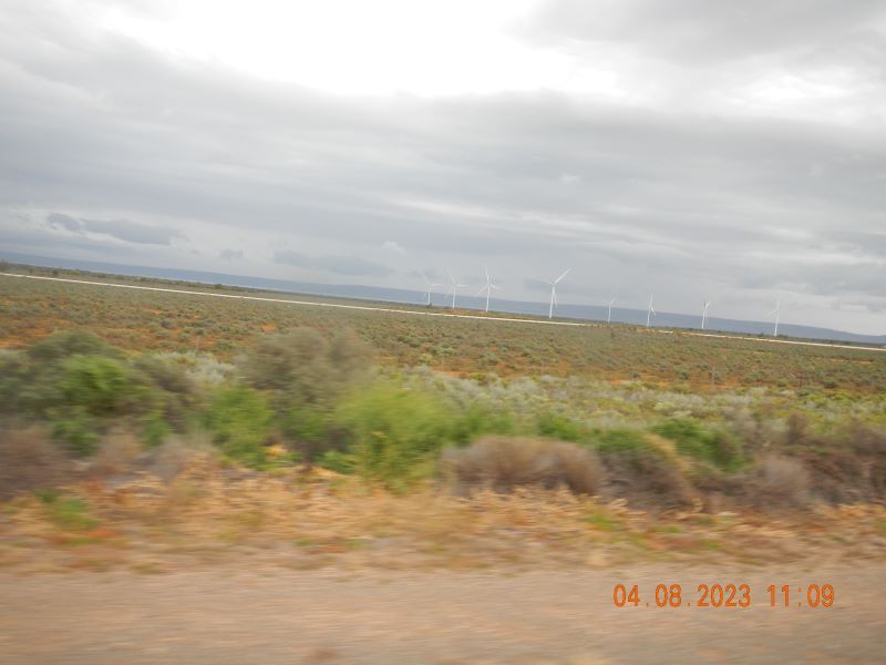 Asked the old mate at the servo what the weather was like heading towards the Gutter and he reckoned I should miss most of it, as I was going through the middle. Well, it was intermittent all the way to Port Augusta and beyond. What I did notice that has changed is all the windfarms popping up, they stand there like white soldiers waiting for the weather gods to instruct them to turn.