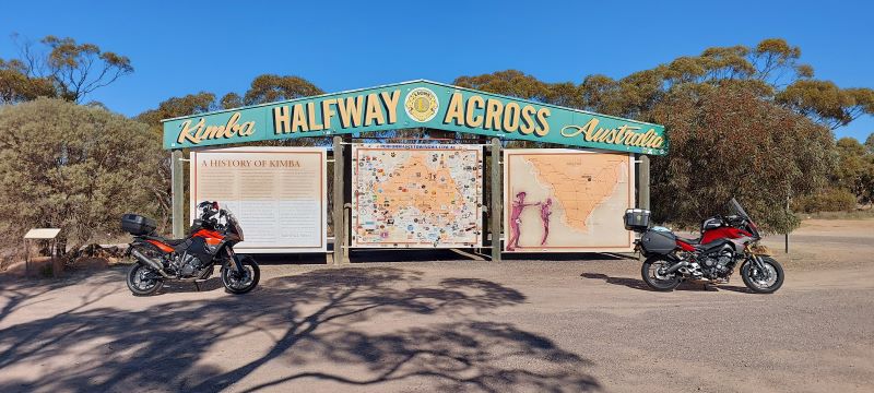 Through The Gutter, past Iron Knob and into Kimba for lunch & a break. The roads are long out here with a slight curve every now and again but the scenery changes, whether it be the cloud formations or the vegetation…it’s still beautiful. Half Way Across Australia is the town of Kimba, also home of the Big Galah, some silo art and a pretty special moment to have Karl with me.