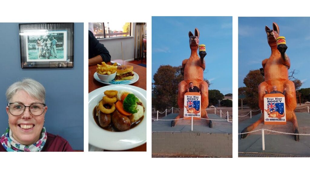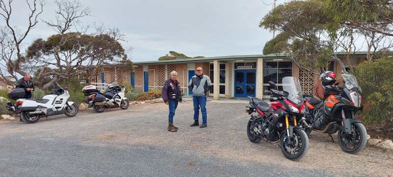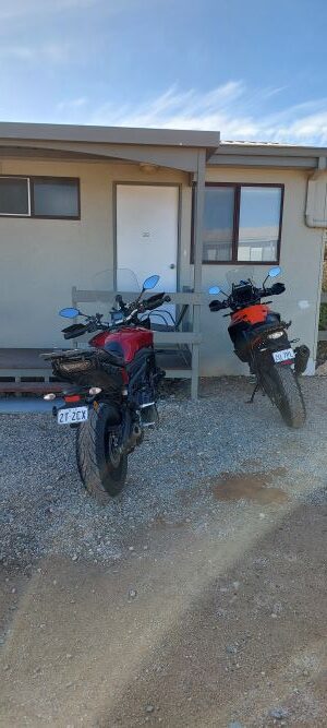 It’s uneventful crossing the Nullarbor, there’s barely a bend in the road but we continue on and pull into Ceduna for fuel and go in search of a café to get some lunch. Well, on a Sunday – fat chance of that. The only place (other than the roadhouse) was “Bill’s Chicken Shop” so that’s where we pulled up. Allo and behold who should also arrive but our stalkers – the boys….LOL. The guys are really a barrel of laughs and I would gladly travel with them any day of the week…..if only for the laughs. They are stopping in Ceduna tonight but Karl & I still have 211kms to go to reach Wudinna, so we are on our bikes and off again. Still raining and just over 2 hours later we get fuel at the Wudinna roadhouse before turning into town and locating the Wudinna Hotel Motel.