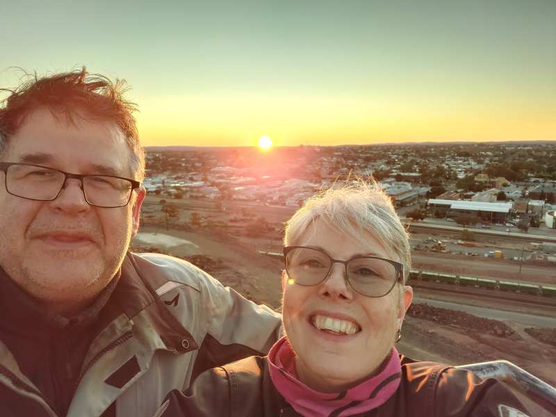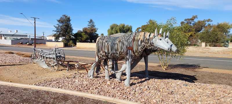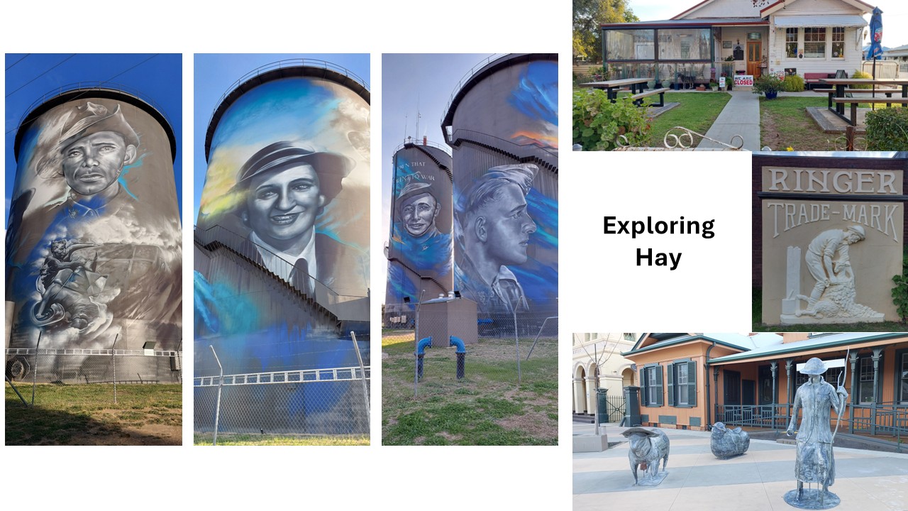 More flat plains and straight roads, watching Karl’s rear tyre which is now resembling a house brick…lol as we travel down into the northern end of Hay. We did pass a look out about 16km north of Hay where if you are so inclined to come back and view the sunsetting over the Hay Plains…. maybe next time when we are in the car. Bidgee Motor Inn is our choice for tonight and Jacky was very lovely welcoming us in. A wonder around town and found some lovely sculptures and of course some silo art. However, my biggest surprise was finding a café (with the same name as one in Corryong) but this one doesn’t do breakfast…WTF!! I mean what café doesn’t serve breaky. There is a bakery and a little fancy café but it doesn’t open until a bit later in the morning. Dinner at the Crown Hotel before returning to our room for our last night’s sleep on the road.