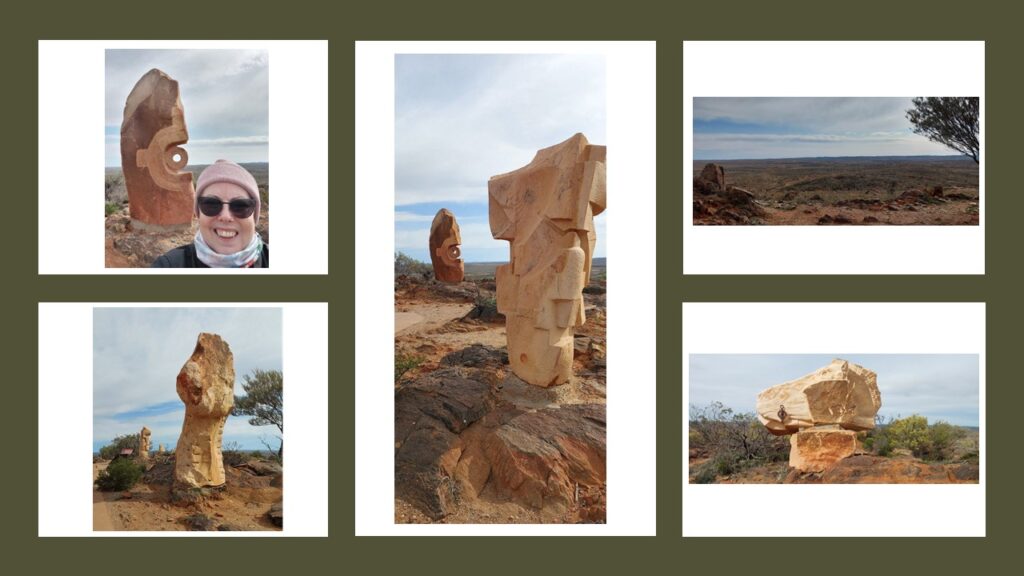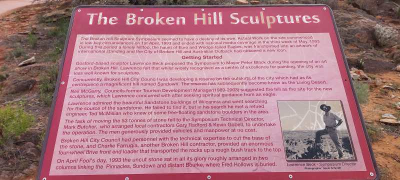 On the way back from our Silverton experience we went up to see the Desert Living Sculptures about 10km out of Broken Hill. You now must pay to go up to view the sculptures and they sting you a pretty penny for the privilege. We wind our way through the landscape before reaching the carpark and embarking on our Sculptural experience. The weather is wearing away a lot of the carvings in some of the stones but others are still ok. Karl critiques the art, however his critic skills need some honing.