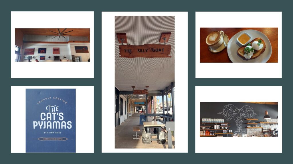 Nice to sleep in again with no pressure and all the time in the world. On our walk around yesterday we spotted a café that we had breaky in this morning. A little bit of sophistication this morning. Another quirky urban café called The Silly Goat. They serve Cats Pajamas Coffee…..hope the pussies aren’t cold without their pj’s this morning. Karl had Perusian Mushrooms on sourdough and I had the poached eggs and we both had coffee….all was delicious.