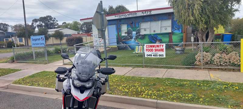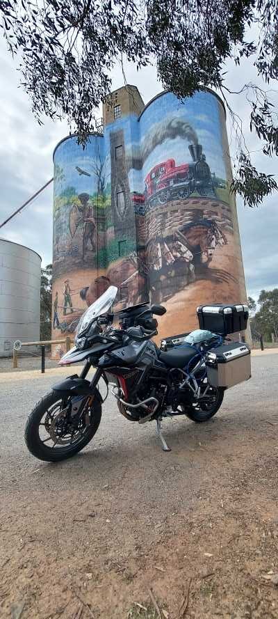 Through some B & C roads and the rains stopped, skies are now cloudy, but the wind has picked up. Stopped up at Tungamah for some art and bumped into a lovely older couple wondering what I was doing out on a day like this on my own. Killing demons was my initial response but clarified with recovery process of a previous motorcycle accident and strangely enough they understood. Making new memories with Fergus.