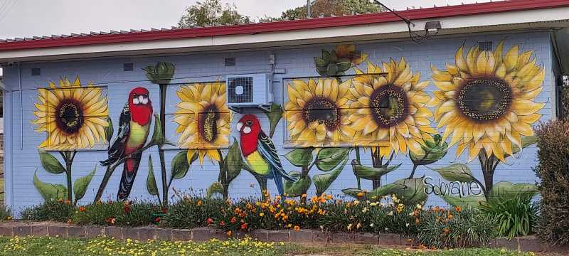 Barnawartha and it started to rain, great but really, I just took a deep breath thought “this is nothing, just large drops”. Rutherglen and according to the Silo Art Map the Silo here isn’t started but as I got closer to the roundabout, it’s totally finished. Not being totally comfortable on Fergus yet to navigate u-turns, diversions, I kept going…..I can always come back to it.