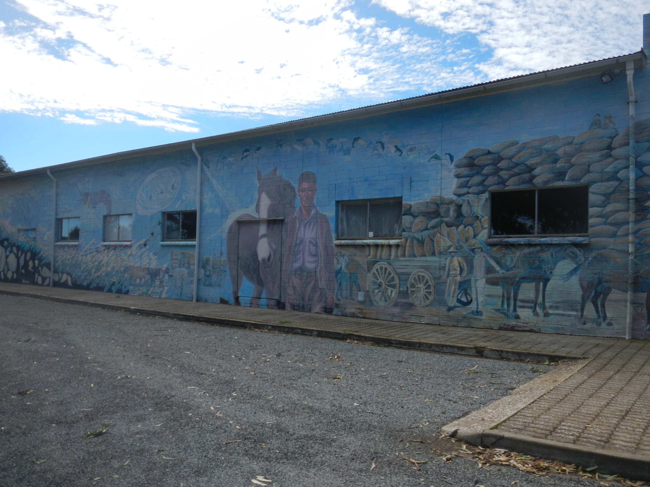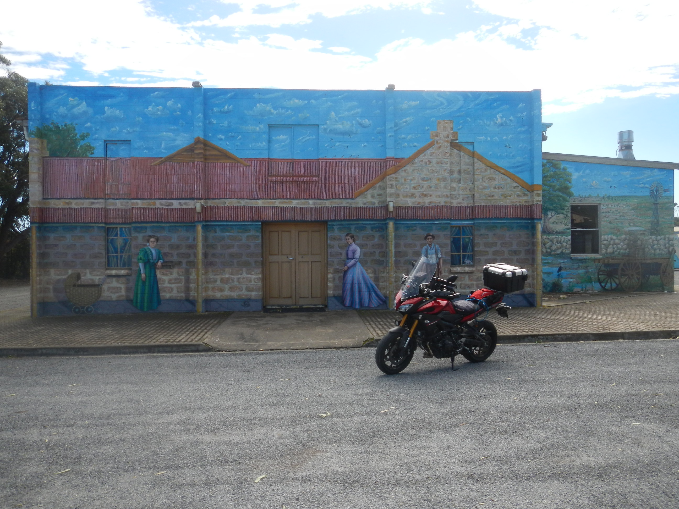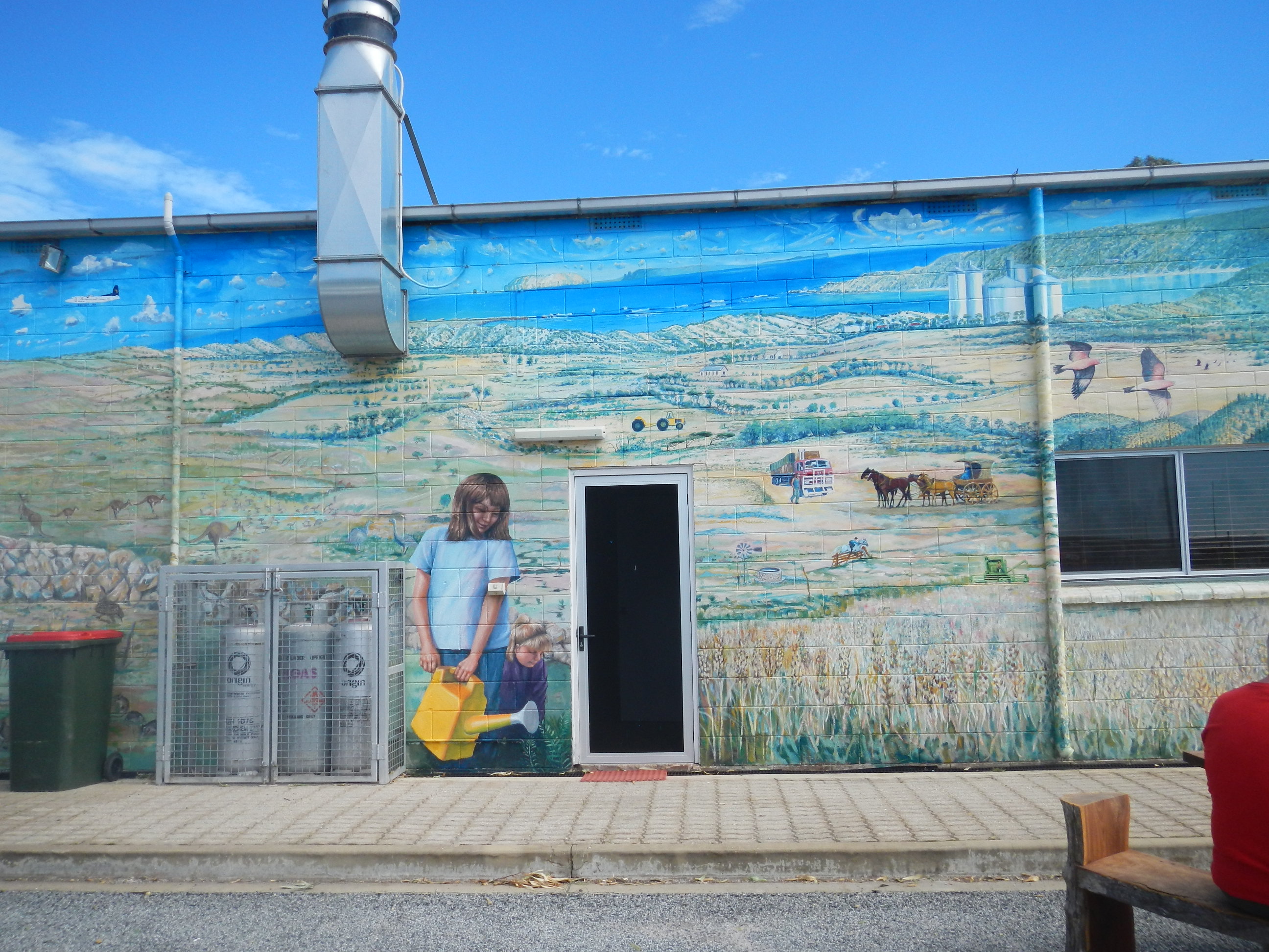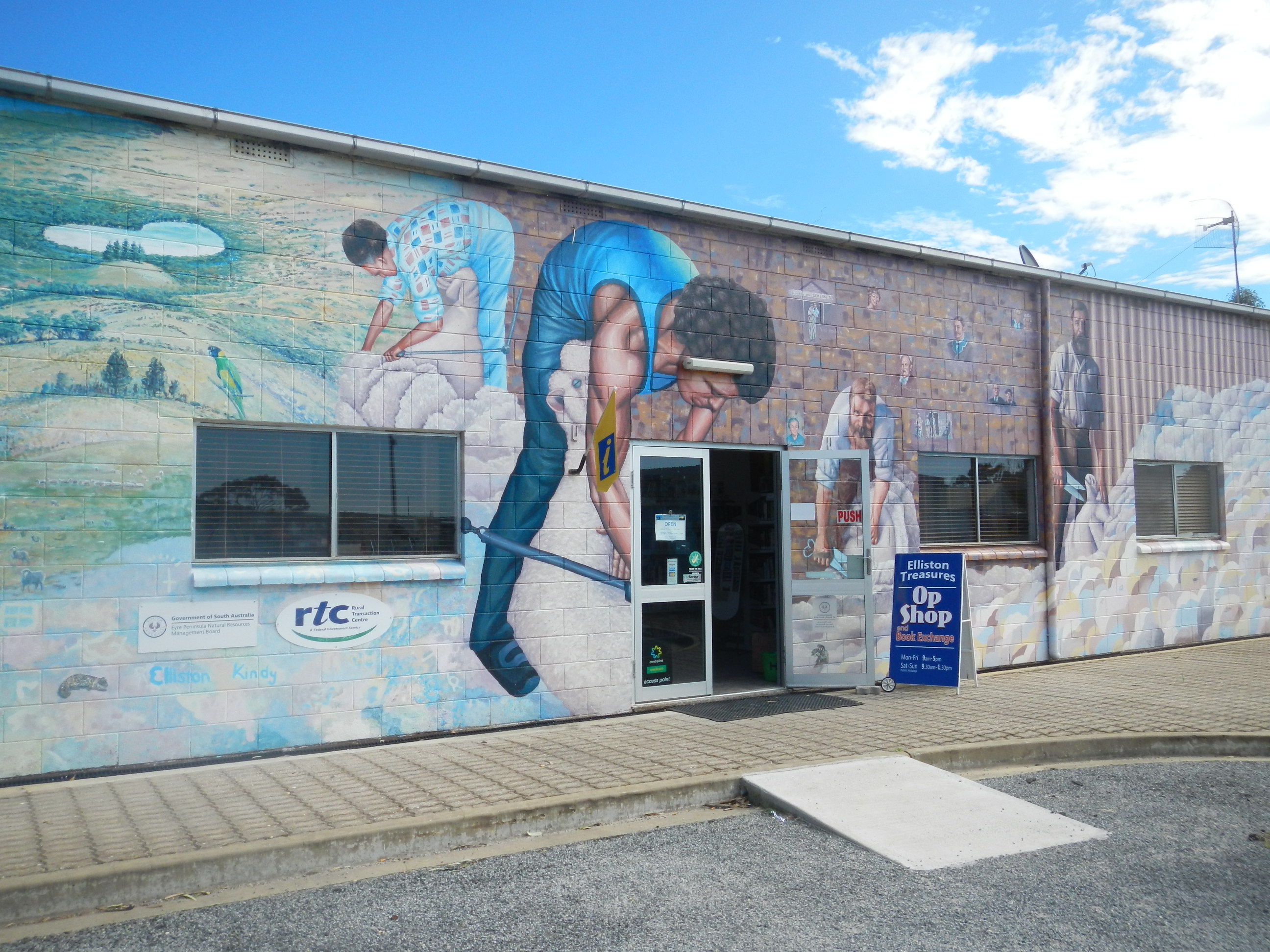 Back into town and lunch today is at the roadhouse – a toasted ham and cheese croissant, before heading into town to the bakery for a “real” coffee. But not before checking out a mural painted community building. Turns out to be the OP shop but isn’t the artwork fantastic.